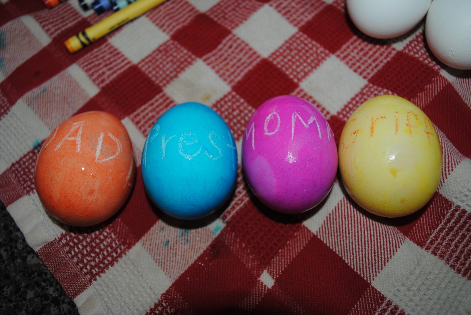 Griffin LOVES to dye Easter eggs! Every year we write on the eggs with crayon then dye them, my mom taught me that trick when I was a kid. I love how the white shows up.
